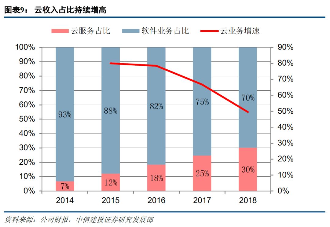 公司自2014年云业务收入过亿后,每年持续高速增长,2015-2018年增速分别为80%、78%、67%、50%,云业务收入占比逐渐增大。2018年公司实现软件收入19.6亿元,云业务收入8.5亿元,云业务收入占比达到30%。