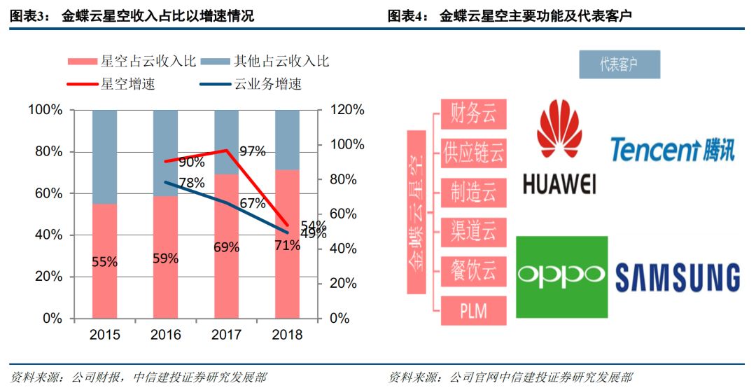 作为中国云转型的引领者,公司云业务产品从聚焦开始迈向多元。当前公司云业务主要聚焦于核心产品金蝶云星空,该产品一直是公司云业务最重要的产品,2017年至2018年占云业务收入比重年基本保持在70%左右,其收入增长一直高于整体云业务增长,2018年实现收入同比增长53.8%(云业务收入同比增长49.5%)。金蝶云星空主要面向中大型、成长型企业提供解决方案,主要的方案有:财务云、供应链云、制造云、渠道云、餐饮云、PLM云等,代表客户有华为、腾讯、三星、OPPO等超级巨头公司,凭借该产品公司一直保持中国SaaS企业市占率第一名的位置。