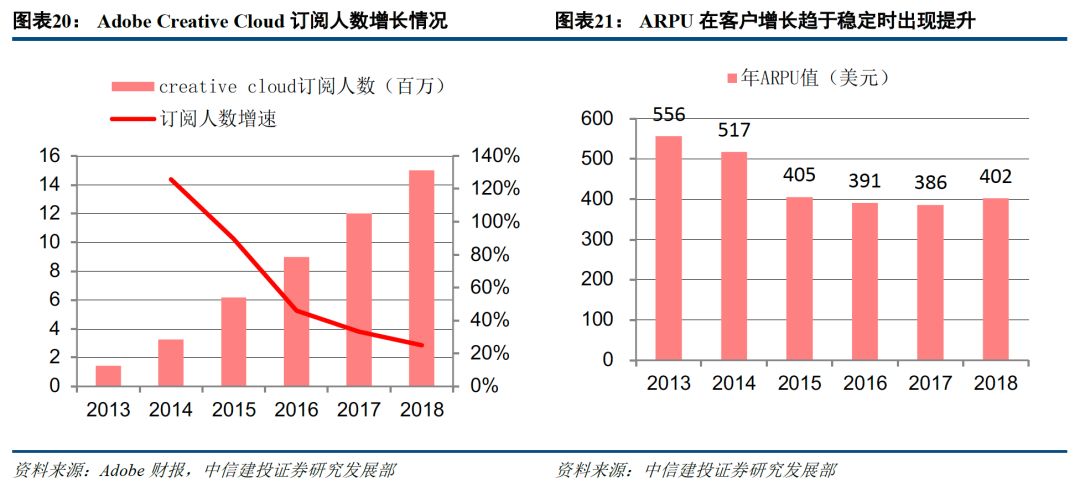 我们认为云转型初期ARPU值下降属于正常现象,海外公司在客户数量高速增长的情况下都经历了ARPU的下降,但随着客户数量增长趋于稳定,ARPU值的增长为海外云计算公司带来第二动力。以云转型典范Adobe为例:Adobe于2013年开始云转型,转型之初Creative Cloud订阅客户数量高速增长,2017年订阅客户数达到1200万,2014-2017年订阅客户增速为:126%、90%、46%、33%,ARUP值由517美元下降到了386美元,但是随着客户数量增速趋于稳步增长,ARPU值开始回升,2018年ARPU值首次实现同比提升,达到402美元。