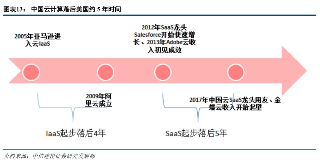 随着基础设施的成熟,美国SaaS在2012年左右开始了快速增长,例如:云SaaS龙头收入增速自2012年开始进入了加速增长期,2012-2015年收入增速同比增长37%、35%、33%、32%,传统软件巨头Adobe于2013年开启了云转型之路;而我国云SaaS龙头用友、金蝶云收入在2017年才有较大体量,整理来看落户美国约5年时间。