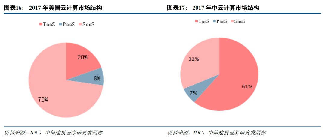 根据Gartner,2017年美国云计算市场占据全球59.3%的市场份额,中国占据6.2%的市场份额,中美之间云计算整体市场规模存在约10倍的差距。细分来看,美国云IaaS龙头亚马逊2017年云收入为175亿美金,而中国云IaaS龙头阿里2018年云收入为21亿美金,中美IaaS巨头差距约8倍;云SaaS龙头Salesforce 2018年收入为133亿美金,而中国云SaaS龙头金蝶、用友2018年收入规模约为1.3亿美金,收入体量上存在约100倍的差距。