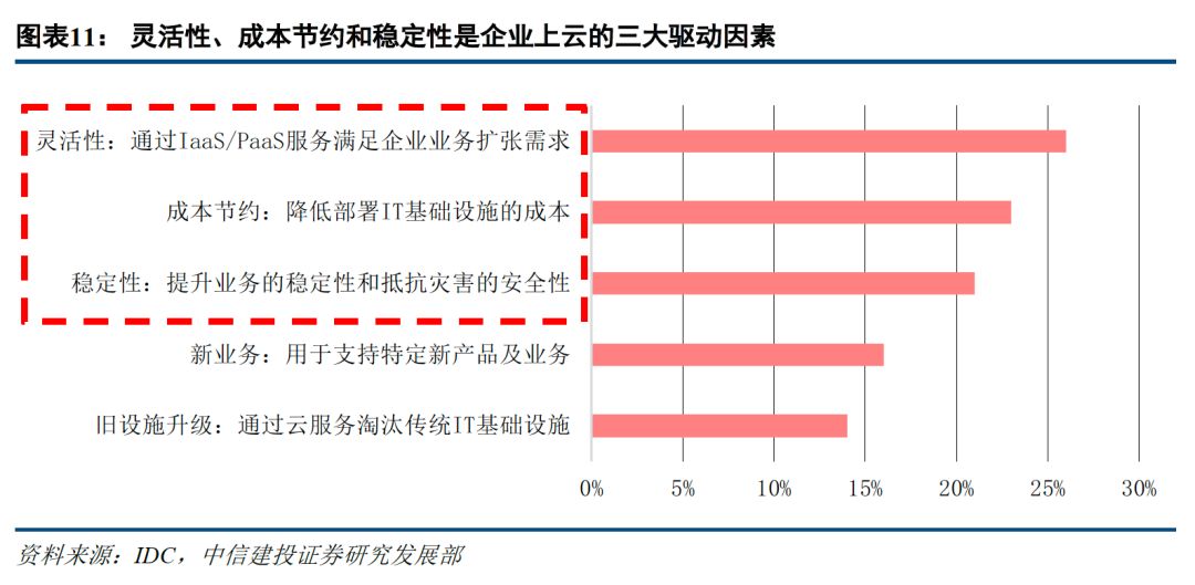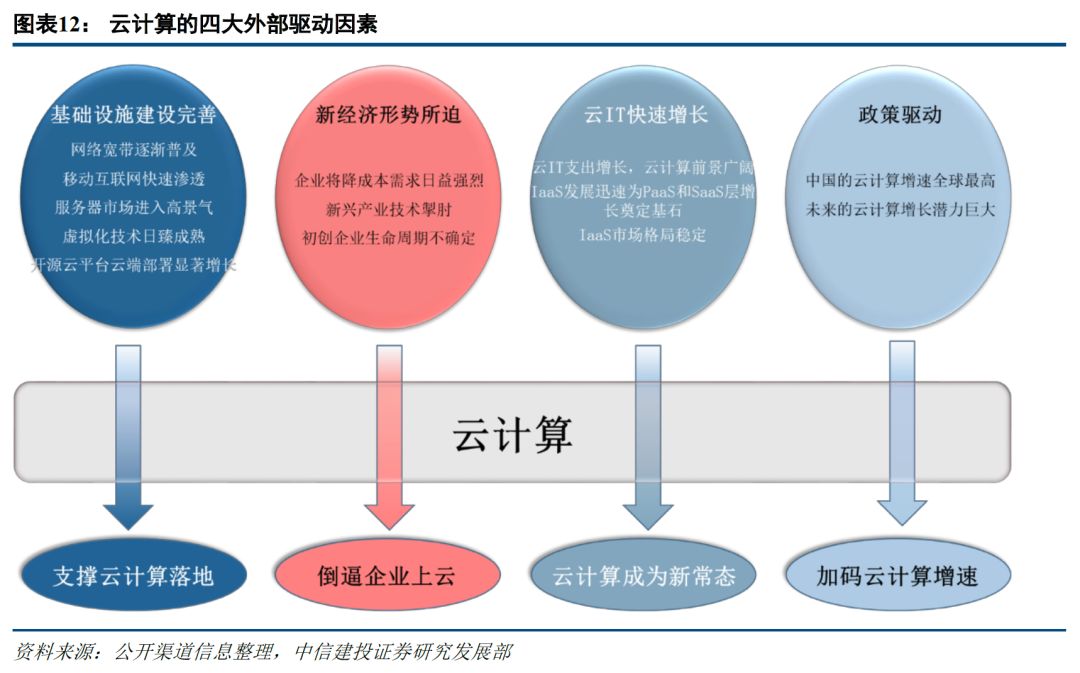 除了云服务本身特性之外,以基础设施完善为前提的四大外部驱动因素为云服务的落地完善了外部条件。四大外部驱动因素分别为基础设施完善、新经济驱动、云IT的快速增长和政策驱动。