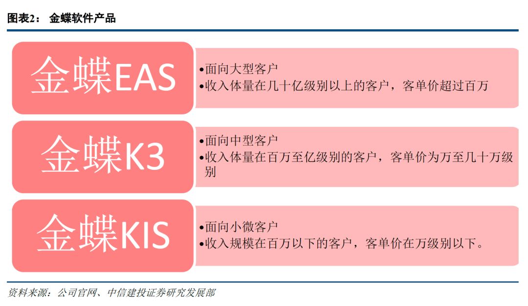 公司是国内软件厂商最早开启云转型的厂商之一,也是转型最成功的厂商之一。目前公司主要的软件产品主要有三种:面向大型客户的金蝶EAS、面向中型客户的金蝶K3、面向小微客户的金蝶KIS。各类产品按照模块收费:EAS主要面向收入体量在几十亿级别以上的客户,客单价超过百万;K3主要面向收入体量在百万至亿级别的客户,客单价为万至几十万级别;KIS主要面向收入规模在百万以下的客户,客单价在万级别以下。