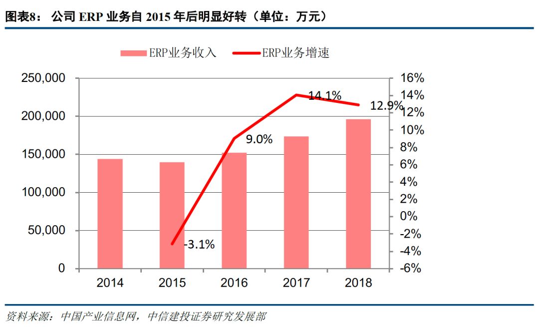 表现在公司ERP业务收入上来看,自2015-2018年收入增速基本保持上升态势,分别为:-3.1%、9.0%、14.1%、12.9%。