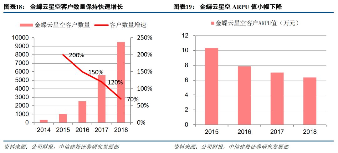 云转型初期依靠新增客户快速提升。公司云转型以来,收入高速增长,2018年云业务收入是2014年的8倍,其主要原因是由于新增客户数量的快速增长,由于金蝶云星空一直是公司云业务收入的主要来源,故我们选取金蝶云星空客户数量作为标本,2018年星空的客户数量为9500个,2015-2018年金蝶云星空客户增长速度为200%、150%、120%、70%,是云收入增长的主要原因。