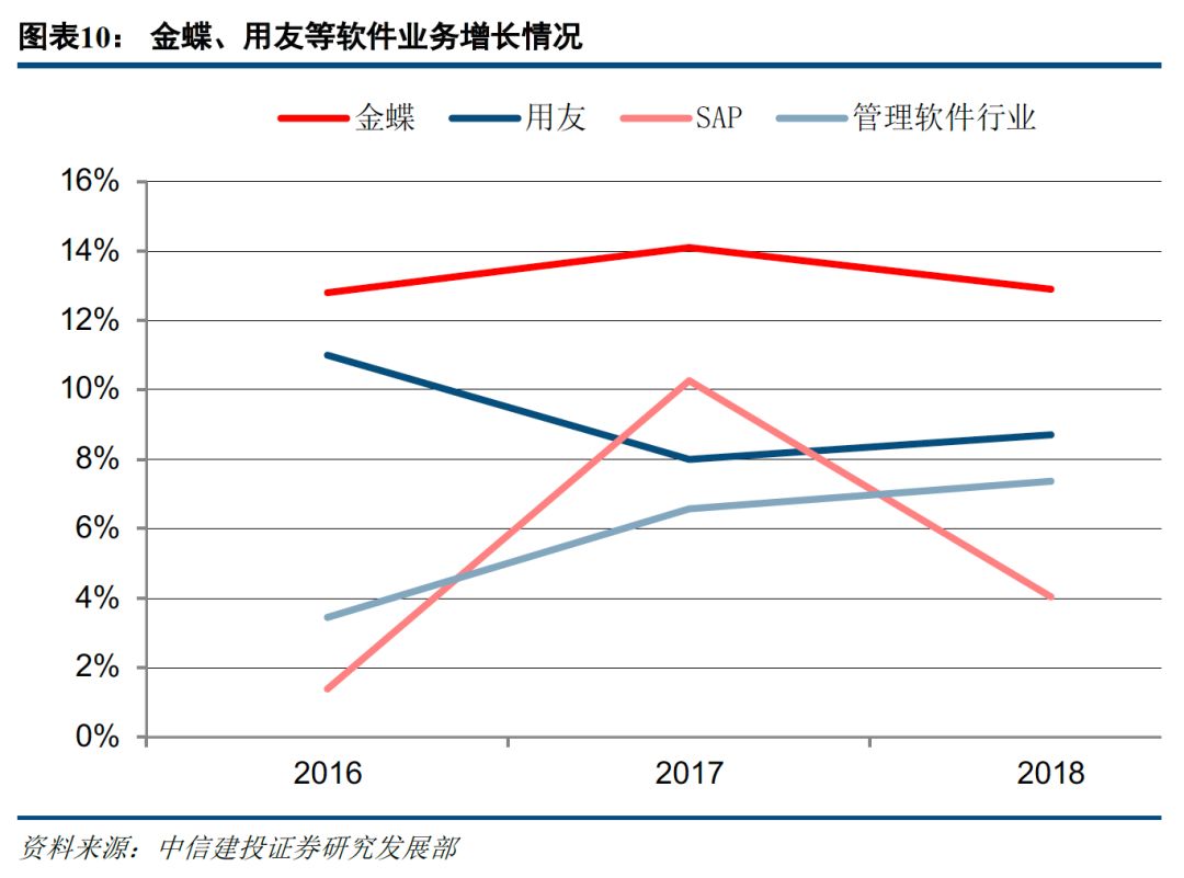 我们认为公司当前云业务的高速发展主要是来自新增客户的需求,并非老客户软件转云,具体体现在软件业务在明显高于行业增速的基础上,云业务在高速增长。我们将公司软件收入增速与管理软件行业增速、用友网络软件收入、SAP亚太(除日本)区收入进行比较,2016-2018年公司软件收入一直处于可比范围内最快水平,分别达到12.8%、14.1%、12.8%,因为我们认为公司云业务的快速发展并非“左右互搏”。