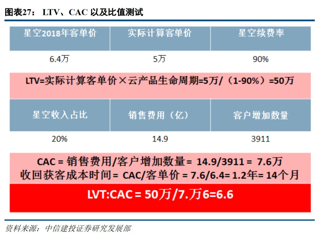 首先客户生命周期价值(LTV)代表单个客户在其整个生命周期中对公司产生的收入总值。由于金蝶云星空占公司绝大部分云业务收入(无论是公有云还是私有云都是每年收取费用),因此我们以星空为例测算。根据定义,LVT=客单价*该客户的生命周期,我们已知2018年星空的客单价为6.4万(图19),在客户数量高速增长阶段,客单价会进一步下降,加至考虑到未来现金折现,因此保守给予客单价为5万,根据星空90%以上的续费率计算得到LTV值为50万。