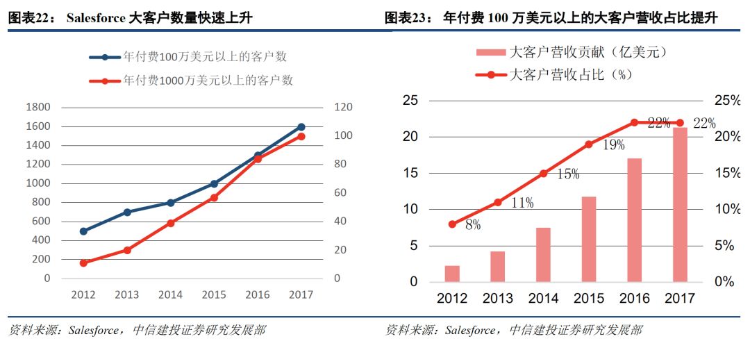以CRM起家的Salesforce为例,大客户营收占比不断提升使得ARPU值大幅增加: