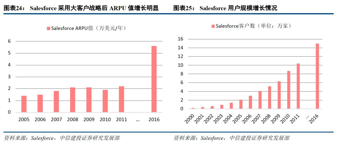 云化时代的另一个推动维度是ARPU值提升。ARPU值提升背后的原因其实是软件使用价值的提升,CRM、ERP、企业财税等管理类软件对应的管理需求极大,这些软件云化之后将相应地具有更大的ARPU值提升空间,海外经验表明抓住大客户市场可以带来ARPU值提升。