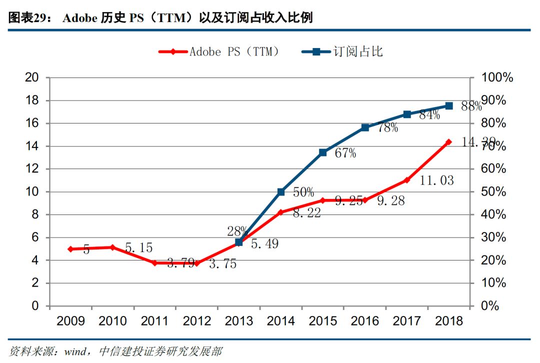 我们认为金蝶国际当前已经进入云转型成熟期,未来云化趋势已经确立,预计2020年云收入占比将超过50%。因此我们认为公司当前应当按照云转型成熟期来估值。采用海外公司阶段对标法,我们选取经历了完整云转型的公司Adobe,与其处于云转型成熟阶段进行对标。