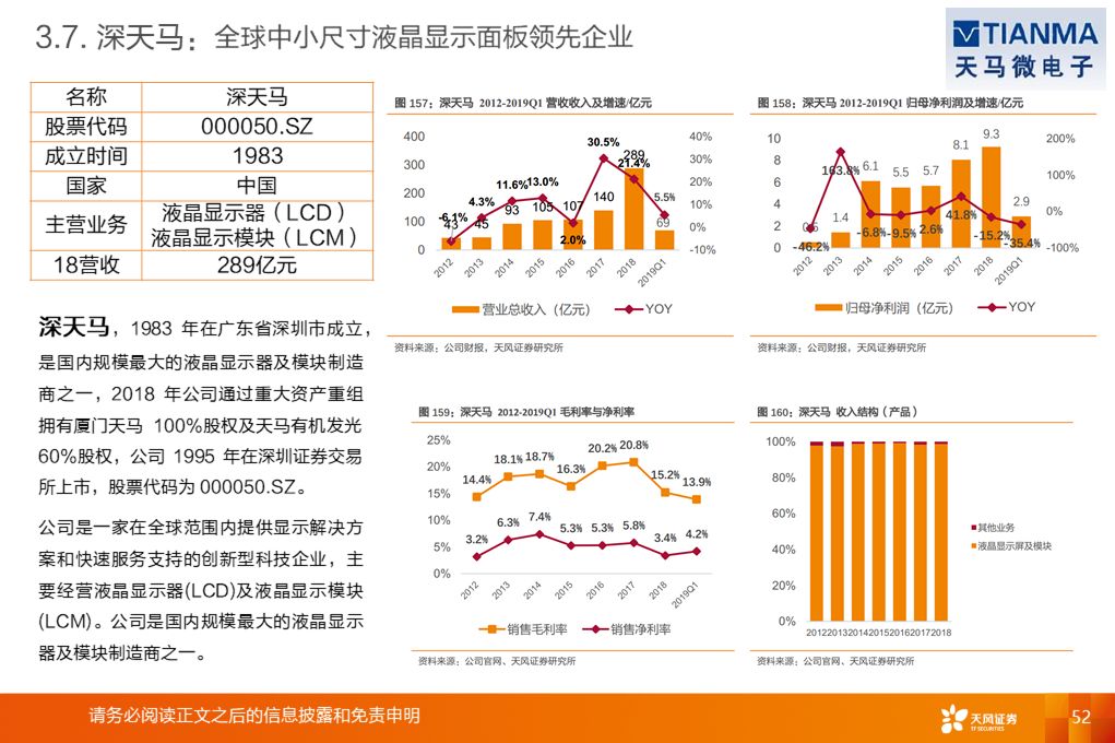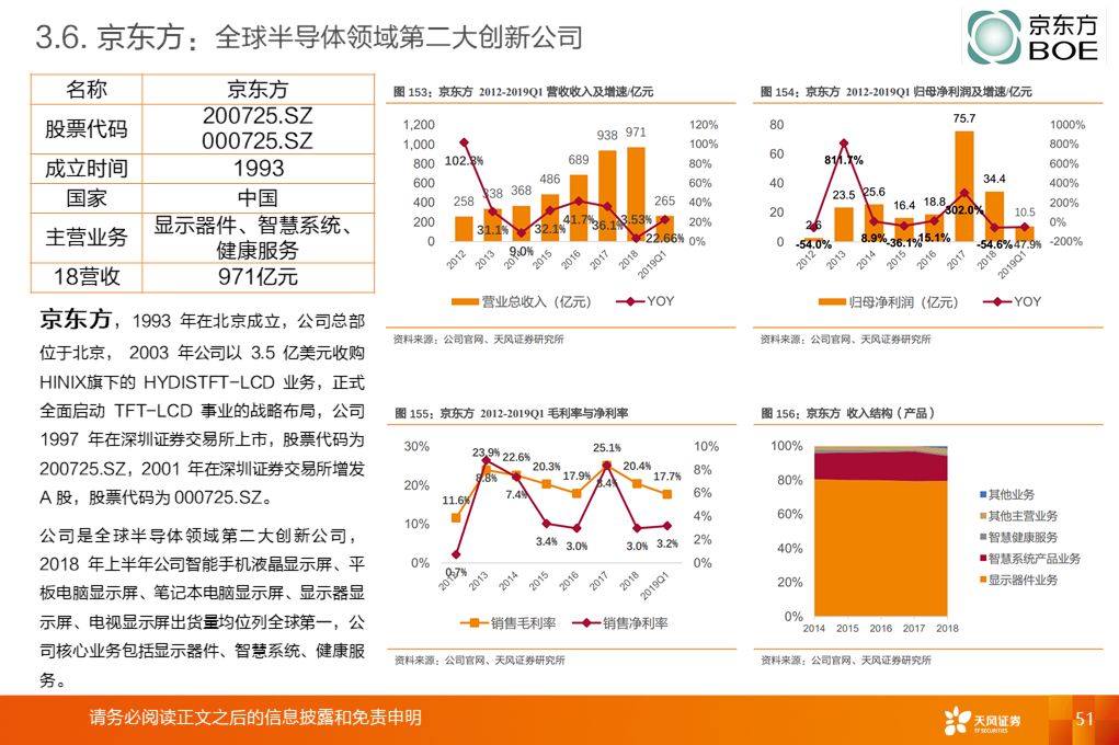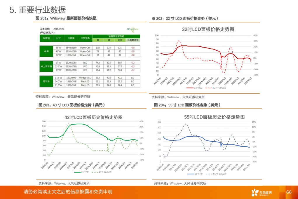 LCD面板景气度回暖:19Q1单季度营收同比增速为3.5%,增速同比增长5.6pct、环比持平。行业平均毛利率有望探底:面板板块19Q1平均毛利率为12.8%,同比下降4.2pct,环比下降5.7pct。LCD价格19Q1反弹后回落:Witsview数据,2019年7月上半月LCD面板价格:32寸39美元(MoM,-3),43寸80美元(MoM,-4),55寸 121美元(MoM,-9)。