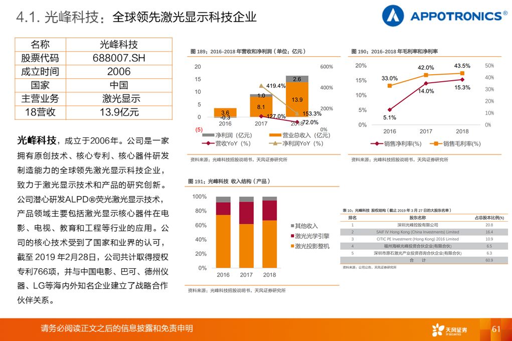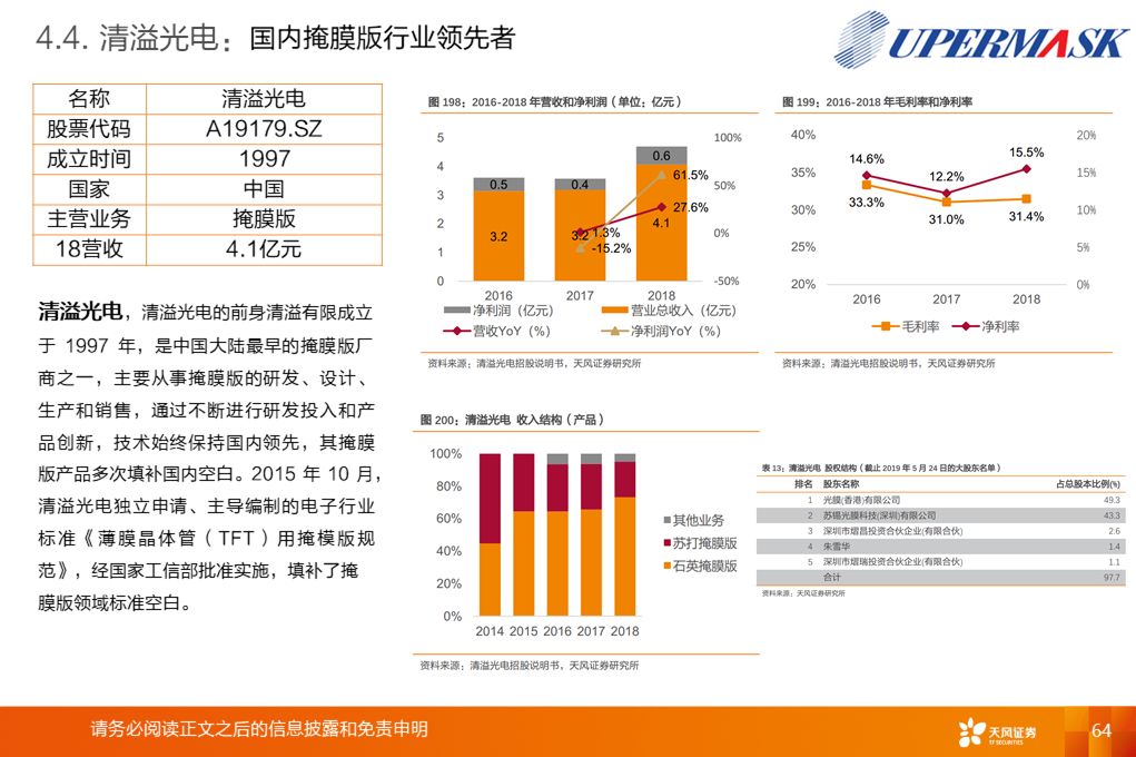 随着大陆本土供应链逐渐成熟,不少上游公司已经发展初具规模,多家公司将登陆科创板,涵盖面板行业液晶材料、掩膜版、检测设备和激光显示等领域,具有较强的科技创新能力和核心技术积累,在面板行业国产化加速发展的背景下,未来将有望持续增长,建议重视华兴源创、八亿时空、清溢光电以及激光显示领域的光峰科技等。