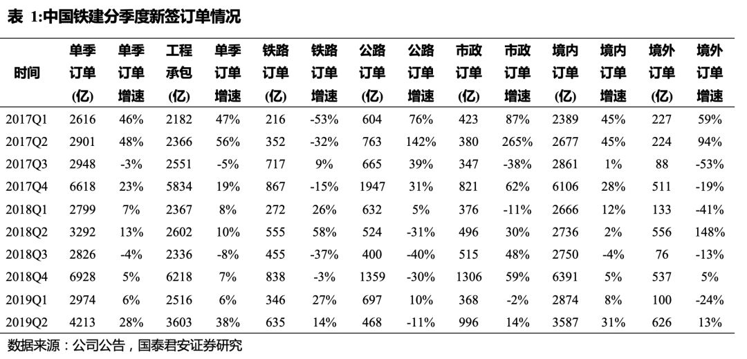 中国铁建中报业绩增速16%超预期,且新签订单明显提速,受益H2施工旺季及基建投资有望好转,订单业绩现金流都将好于2018年,当下估值低涨幅低与基本面好转明显错配。