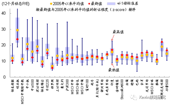 与2005年以来的均值相比,美股、韩国、MSCI全球估值高于均值,而港股、A股、日本估值有折让