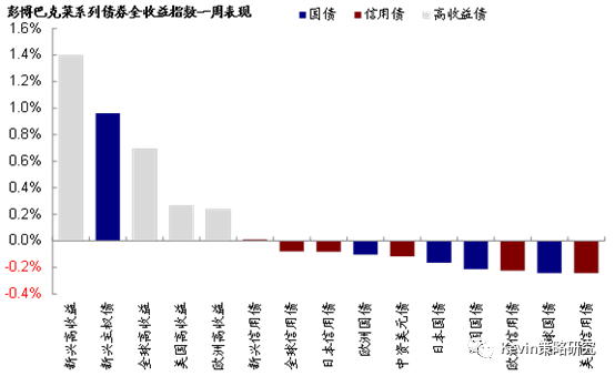 过去一周,高收益债>信用债>国债,新兴高收益、新兴主权债领先,而美国信用债、全球国债表现不佳