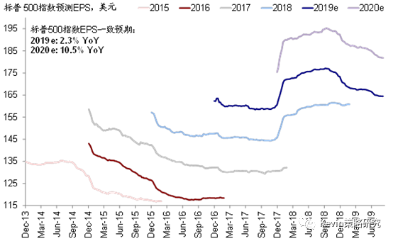 市场一致预期标普500指数2019年EPS同比增长2.3%,2020年同比增长10.5%