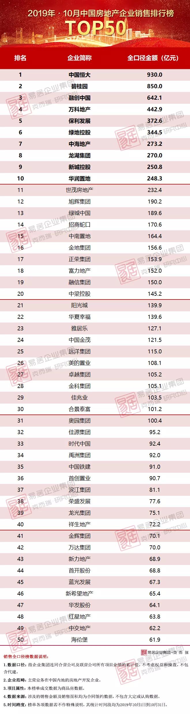 TOP10房企中,恒大、碧桂园、融创10月业绩表现突出,继9月之后单月销售规模继续保持行业领先。