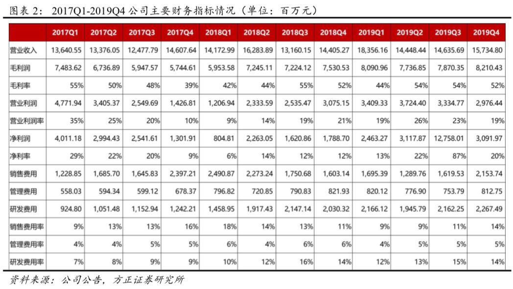 (4)利润率情况:19Q4公司毛利率为52.2%(YoY-0.1pct,QoQ-1.6pct),营业利润率18.9%(YoY-3.9pct,QoQ-3.9pct),净利率19.7%(YoY+7.2%,QoQ-67.5pct)。