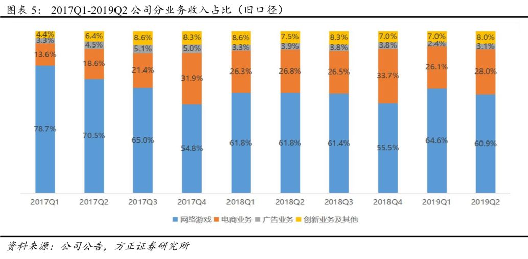 4、创新及其他业务:19Q4收入增长迅速(YoY+17.9%,QoQ+35.0%),毛利率继续改善(达20.6%、YoY+3.6pct/QoQ+5.4pct),网易云音乐将借助新融资继续打造优质原创内容,严选致力于构建价值壁垒,未来增长动能强劲。