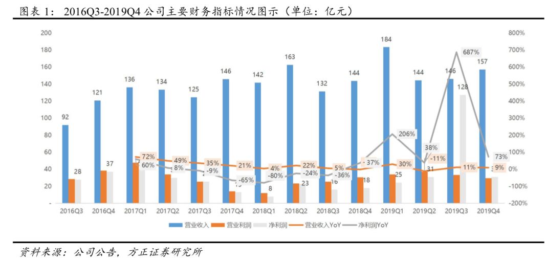 ②19年情况:公司19年实现营业收入592.41亿元(YOY+15.8%),营业利润137.91亿元(YoY+38.2%),净利润214.31亿元(YoY+230.9%),归母净利132.75亿元(YoY+60.1%)。