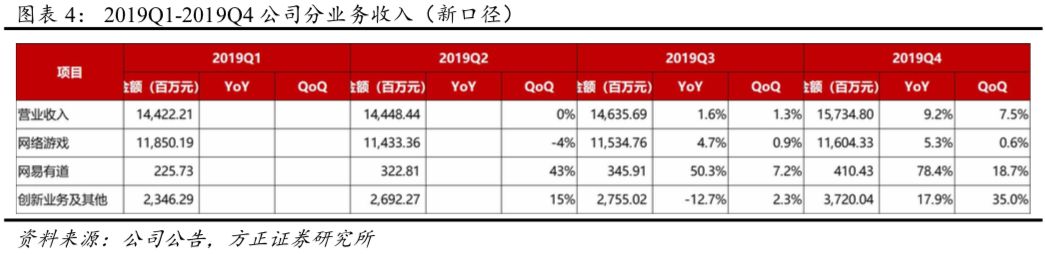 (1)分业务收入:19Q4公司实现网络游戏业务收入116.04亿元(YoY+5.3%、QoQ+0.6%);网易有道收入4.10亿元(YoY+78.4%,QoQ+18.7%);创新业务及其他收入37.20亿元(YoY+17.9%,QoQ+35.0%)。