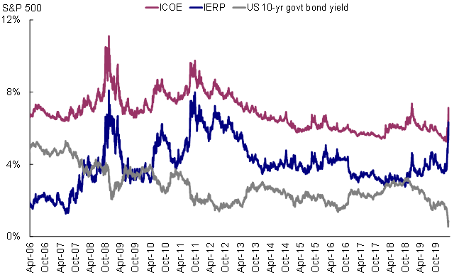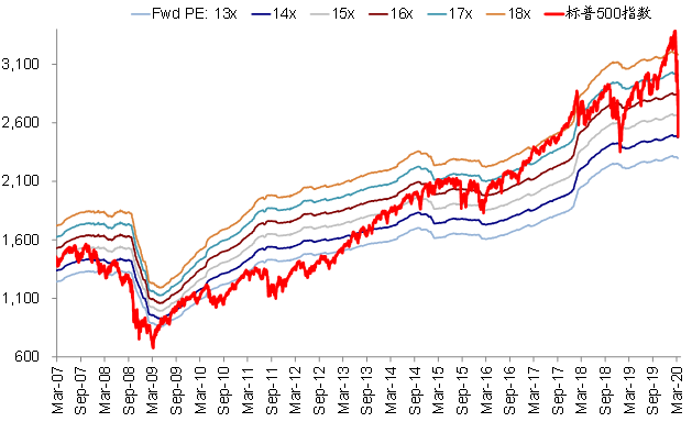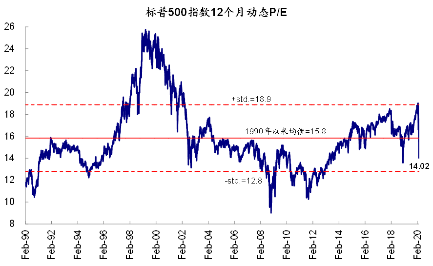 2)估值水平已经明显低于正常均值,但还不算最为极端,且或尚未充分纳入盈利下调的影响。当前美股14倍和16.3倍的动态和静态估值已经显著的低于长期历史均值,但也并非作为极端的情形;同时对于动态估值而言,如果假设今年的盈利增速因事件影响基本萎缩到零增长的话,14倍的估值可能会被动抬升至14.9倍。