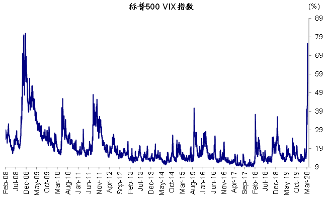 3月12日,海外主要股市经历了异常惨烈的一天,用“黑色星期四”来形容也不为过。美股一周之内第二次“熔断”,收盘跌幅接近10%,这是历史上第四大单日跌幅,也是周度表现上仅次于2008年10月和1933年7月的第三大跌幅。标普500指数从2月19日高点跌幅已经达27%。欧洲股市跌幅更是超过12%,短短几周之内就回到接近2016年初的低点。VIX大涨至2008年的高点。不过值得注意的是,黄金同样大跌3.6%,同时美元指数走强一度超过98;美债盘中也一度升至0.9%,收盘回落至0.82%附近。