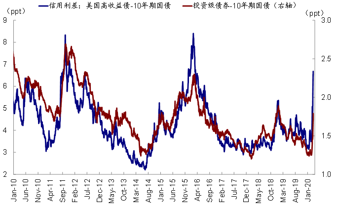 2)信用市场的“薄弱环节”,资产价格的普遍大跌和流动性的暂时缺乏都有可能对风险等级偏低的信用资产特别是高收益债资产带来更大压力,进而在极端情况下成为放大冲击的“薄弱环节”。昨天之前,高收益债利差已经扩大至2016年初油价低位以来的高点,且此前高收益债券基金也出现持续的资金流出。我们在专题报告中对此传导逻辑做过详细讨论,在当前美国企业自身杠杆本来就偏高,而油价大跌和卫生安全扩散又可能导致部分行业公司现金流和营收进一步承压的背景下,二级市场的价格下跌和资金流出会影响到一级市场发行,进一步反馈到企业的经营和信用状况上。往前看,受卫生事件、油价大跌和风险敞口较大的行业,如能源、航空公司、酒店、餐饮、度假休闲、商业地产等中是会出现违约甚至破产的“薄弱环节”值得密切关注;而相应高收益债券基金是否会采取赎回限制措施甚至被迫清盘也可能是触动市场神经的催化剂。