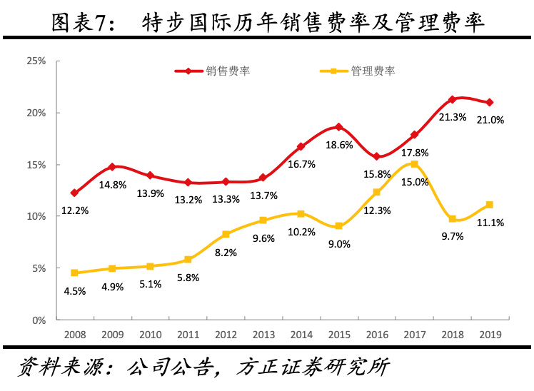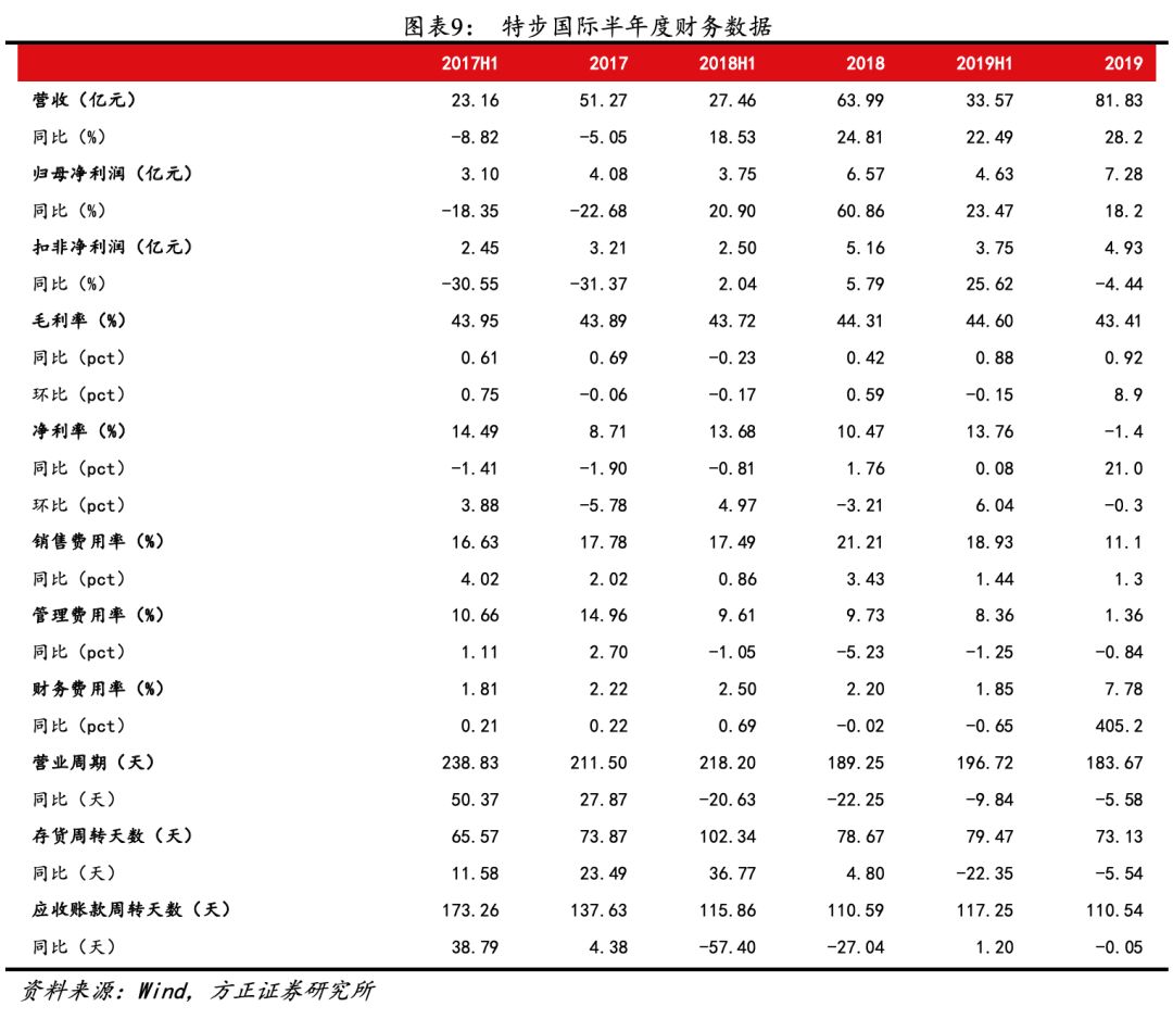 (4)净利率及ROE:①净利率:因毛利率下降0.9pct、本期1亿元收购费用,2019年经营利润率、归母净利润率略有下降,分别为15.1%(-1.3%)、8.9%(-1.4%)。其中特步主品牌2019年经营利润率达16.7%,较上年提升0.3pct。②ROE:2019年ROE下降0.54pct至11.91%,其中净利率、权益乘数、资产周转率分别为8.91%(-0.56pct)、0.76(+0.05)、1.76(+0.04),下降主因净利率下滑。