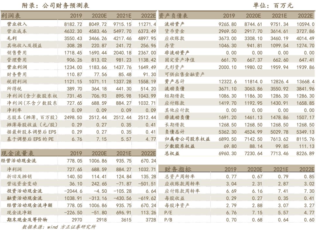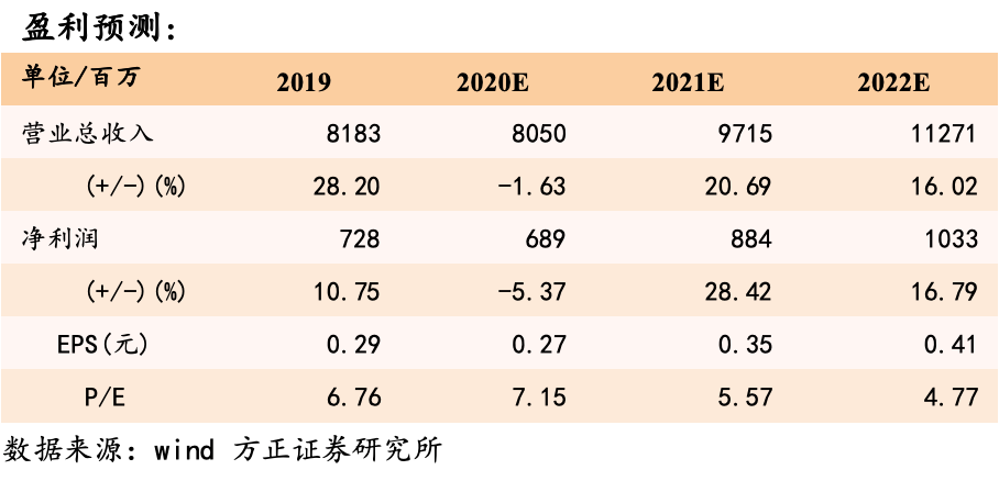我们预计2020/2021/2022年公司归母净利润分别为6.89/8.84/10.33亿元,同比增速在-5.37%/28.42%/16.79%,对应EPS为0.27/0.35/0.41元/股,对应P/E为7/6/5,维持“推荐”评级。