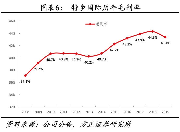 (2)分品类看,①公司2019年大众运动、时尚运动、专业运动三大品类收入分别为77.07、4.66、0.1亿元,三大品类分别对应特步主品牌、收购品牌K-Swiss、Palladium、合作品牌Saucony、Merrell,公司已形成覆盖大众休闲、运动时尚、专业运动多品类的多品牌格局。②特步品牌中,鞋类、服装、配饰2019年收入分别为41.99、33.23、1.85亿元,同比增长7.0%、42.8%、41.0%,占比分别为54.5%、43.1%、2.4%,除鞋品因2019年下半年线上调整转型,减少线上专供款(主要为鞋品)而增速较低外,服装、配饰均为40%以上增速,预计未来服装占比进一步增加,鞋服比例达到1:1。