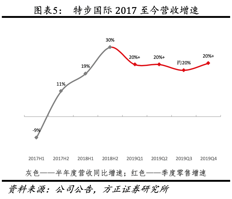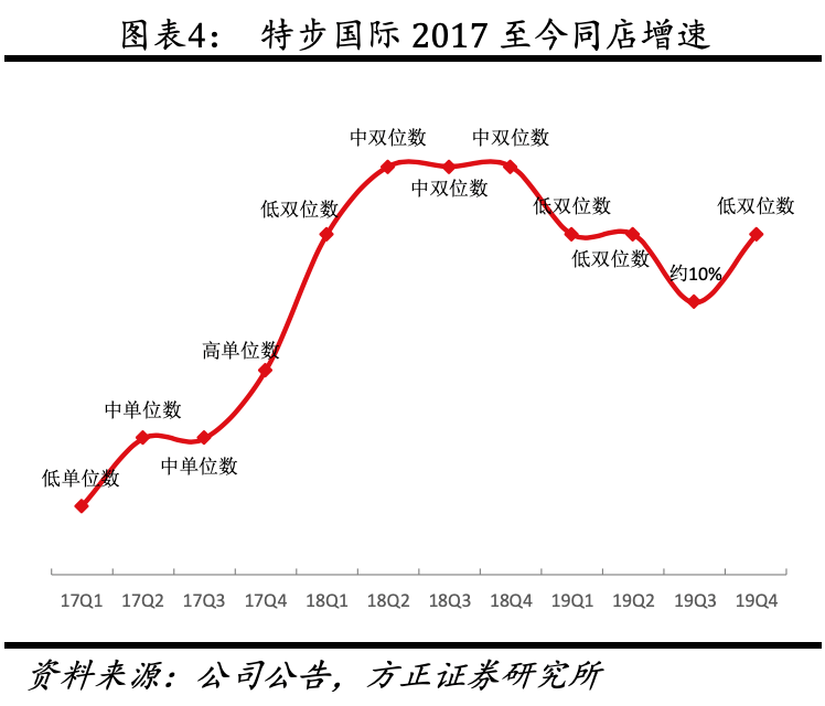 (3)分渠道看,①线上部分,2019年电商收入占比超20%,增速约25%,维持稳定增速。2020年线上专供款比例将减少,O2O将逐量提升至40%左右。②流水方面,2019年全年流水增速超20%,平均月流水约14万,分季度来看,2017H1、H2、2018H1、H2营收增速分别达-9%、11%、19%、30%(2018季度未公布单季度零售额增速),2017H2起公司营收改善明显,2019Q1-Q4零售增速分别为超20%、超20%、约20%、超20%,四季度零售增速回弹。