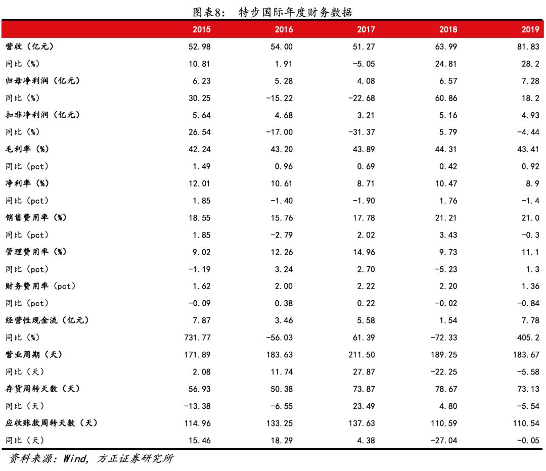 (4)利润规模方面:2019年公司经营利润、归母净利润分别为12.34、7.28亿元,同比增速18.2%、10.8%,扣除1亿元收购费用影响后,经营利润、归母净利润增速分别达27.8%、26%,经营利润率、归母净利润率分别为16.4%(去年同期16.4%)、10.2%(去年同期10.3%),与去年基本持平。拆分来看,特步主品牌、收购品牌、合作品牌2019年经营利润分别达12.88亿元(+23.3%)、-0.46亿元、-0.08亿元,经营利润率分别为16.7%(+0.03pct)、-10.0%、-73.7%,主品牌保持良好经营利润增速,新品牌仍处发展初期。
