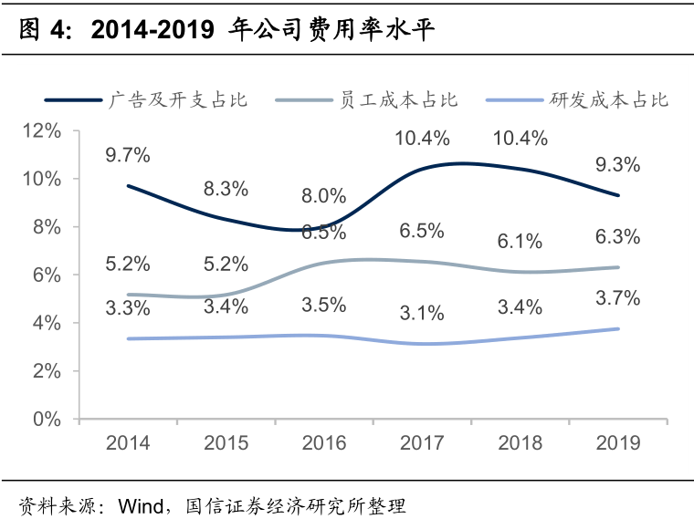 清库存、加大补贴,导致毛利率有所下降。2019年,公司实现毛利率38.4%,同比降低2.6 p.p.,主要是由于低价清除了2019秋冬及2018轻商务的库存;为减轻分销商秋冬季的库存压力,集团向分销商提供销售回扣补贴,以提升打折促销的积极性,造成一次性的不利影响。经营利润率26.8 %,同比降低1 p.p.,净利率22.2%下降1.4 p.p.。优化开支,经营费用率有所下降。