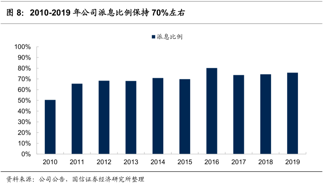 现金充足,保持70%以上派息比例。公司持续维持低负债水平,资产负债率21%。ROE持续在高位,2019年底达到23.2%,随着公司渠道结构的调整与库存的出清,未来仍有望继续提升。即使在公共卫生事件影响下,公司派息比例下降为45.7%,以保持充足的现金应对公共卫生事件影响。
