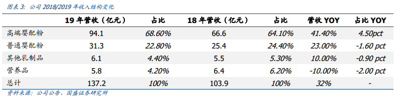 高端婴幼儿配方奶粉产品是公司收入增长核心驱动。2019年公司高端婴配奶粉产品收入为94.1亿元,同比增长41%,占公司总销售收入达69%,是收入增长的主要动力。公司普通婴配奶粉产品收入占比为23%,同比增长23%。其他乳制品和营养补充品分部收入占比分别为4.4%/4.2%,同比增长10%/-10%。