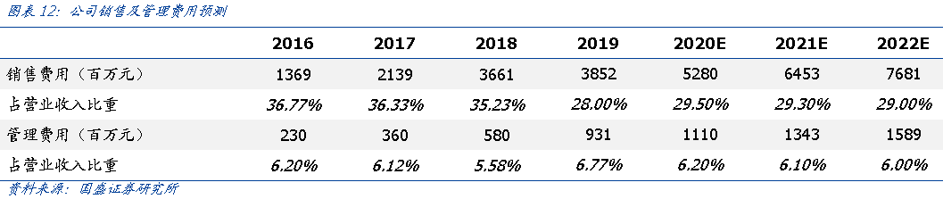 规模效应促进销售费用明显下降。公司2019年销售费用为38.5亿,销售费用率为28%,同比2018年大幅下降7.2pct。我们认为销售费用下降的主要原因是营收增长带来的规模效应。由于销售费用中占比最大的为广告开支,我们认为随着公司经营规模增长,明星产品影响力提升,公司广告费用占比将持续下降,从而带动总体销售费用占比下降。此外,公司市场开拓和营销过程中对费效比控制较好,也有效控制了销售费用的增长。