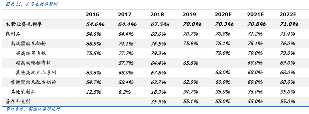 产品结构优化促进毛利率持续上行,领跑行业。2019年,公司综合毛利率达70%,较18年同比提升2.5pct,处于行业领先水平。公司毛利率提升主要原因是公司产品结构持续优化,高毛利的高端婴配粉占比上升。2019年公司高端奶粉占比达68.6%,较2018年提升4.5pct。