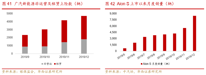 广汽新能源车品牌Aion或将带动广汽新能源车销量走高。AionS表现抢眼,而Aion旗下售价与定位更为高端的Aion LX(纯电动SUV)也于2019年10月正式上市,上市当月批发销售323辆,11、12月销售均超500辆,跻身纯电动中型SUV销量第二名。总体来看,随着Aion品牌车型的不断丰富,预期系列车型月销量有望达到8,000-10,000辆水平。目前Aion系列终端销量结构以2B为主(占70%左右),我们认为,广汽新能源以2B市场作为切入点,逐渐累积用户口碑,长期来看,通过质变撬动量变的过程渗透2C终端,打开主流市场。
