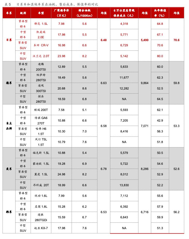 横向比较,广本、广丰在日系扩张趋势中有望脱颖而出。根据汽车之家用户评分显示,广本、广丰主力车型平均得分分别为4.45/4.59(满分5分),较其他日系合资品牌主力车型有一定优势,主要得益于:1)油耗更小,燃油更经济。广本、广丰主力车型每百公里平均油耗比东风本田和一汽马自达少约0.5L;2)保养成本:广本、广丰的主力产品保养费用较其他车企产品较低,6万公里总常规保养成本均值为3,366元,接近达到其他车企主力产品的一半;3)保值率:广本、广丰的主力产品头年保值率为81%左右,且稳定于80%以上。我们认为,广本、广丰产品较其他日系品牌而言,多方面竞争优势明显,未来在日系品牌扩张份额的趋势中有望脱颖而出。