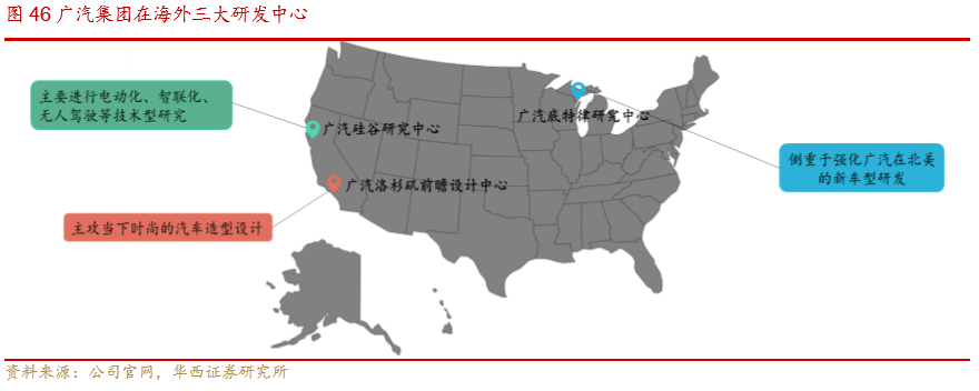 广汽自主新技术研发全球布局。2017年4月,广汽研发中心(硅谷)投入运营,截至2019年年底,广汽集团在海外已有3个研发中心,广汽研发中心(硅谷)专注于人工智能、无人驾驶和新能源技术等技术型研究,广汽研发中心(底特律)则是侧重于强化广汽在北美的新车型研发,广汽洛杉矶前瞻设计中心主攻当下时尚的汽车造型设计等。