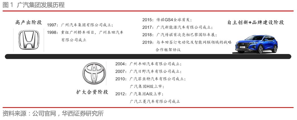 广汽集团是国内首家实现A+H股整体上市的大型国有控股股份制汽车集团。公司产业链布局完整,业务涵盖整车及零部件研发、制造、汽车商贸服务、汽车金融等。主营整车业务兼顾合资/自主品牌,合资品牌包括广本、广丰、广汽菲克以及广汽三菱,自主品牌包括传祺及广汽新能源。
