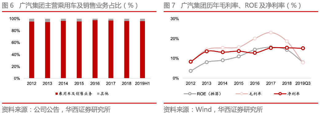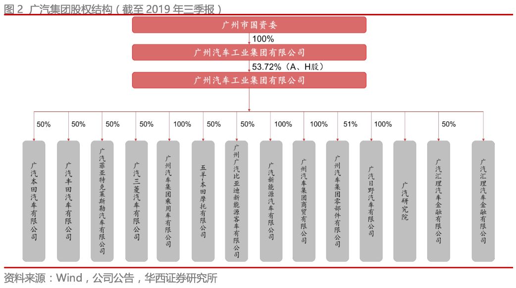 广汽集团股权结构相对集中和稳定,由广州市人民政府100%控股的广州汽车工业集团有限公司绝对控股(53.7%)。整车作为其主营业务,旗下的乘用车子公司包含广汽丰田、广汽本田、广汽菲克、广汽乘用车及广汽三菱等。
