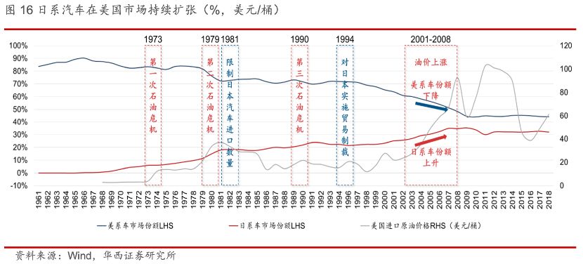 日系在美国市场40年市场份额扩张10倍。日本汽车在20世纪60年代完成了本土的近乎垄断之后开始了其海外扩张之旅。作为拥有巨大体量、发展成熟的美国汽车市场自然是日系汽车扩张的对象。而1973年发生的第一次石油危机所导致的石油价格疯涨让原本偏好大排量、后驱大型车的美国消费者不得不转向强调燃油经济性、高性价比的日系汽车,日系汽车迅速打开了美国市场,而之后美国每次石油价格提升往往伴随着日系汽车市场份额提升以及美系车份额的下降。在美国推出相关政策对日系汽车进口进行限制之后,日系汽车企业纷纷在北美合资建厂,并于20世纪80年代完成在北美的全面布局。从20世纪70年代初到2009年,日系汽车在美国市场份额扩张10倍,2009年达历史最高35%。