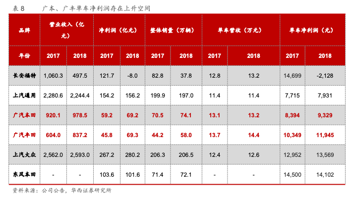 在市占率有所提升的前提下,广本、广丰的单车盈利是否能够获得进一步的提升?在横向比较了国内汽车行业中较为出色的合资品牌的相关数据后,广汽本田、广汽丰田2018年的单车净利润分别为9,329元和11,945元,而业内顶尖的合资品牌如东风本田、上汽大众等2018年单车净利润均在14,000元左右。基于市占率尚存较大提升空间的前提,广本、广丰在销量形成了更大的规模效应后,广本、广丰的单车净利润或存在一定的上升空间。