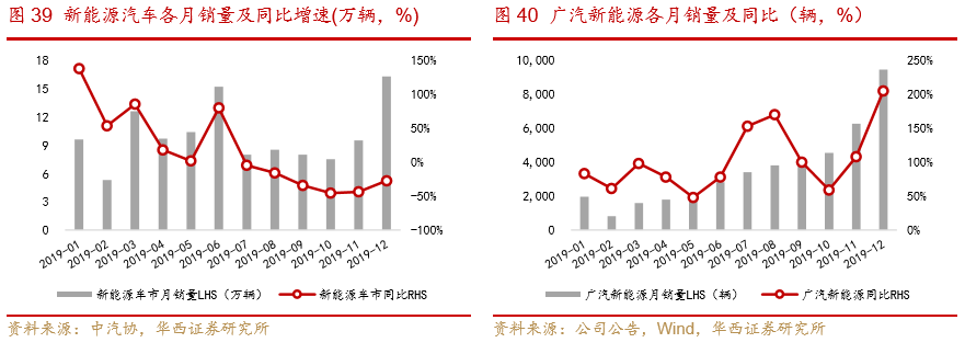 广汽新能源逆市增长,2019年业绩亮眼。2019年,新能源汽车市场整体增速呈下降趋势,7月开始步入同比负增长,主要原因在于新能源汽车补贴退坡落地结束行业过渡期,销量明显承压;广汽新能源2019年销量达4.2万辆,同比上升110.6%。从2019年各月来看,广汽新能源销量始终保持同比40%以上的高速增长。我们预测,2020年新能源汽车行业供给端质变推动销量复苏,总量预计突破160万辆,而广汽新能源将借行业修复之势,实现持续性增长。