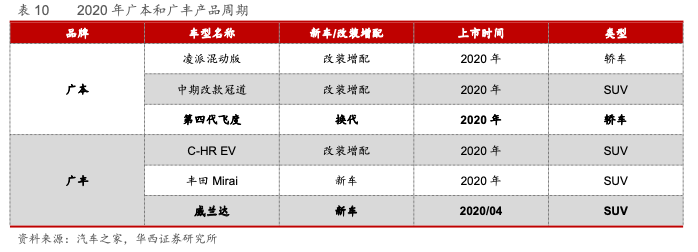 广丰:1)C-HR EV延续燃油版的设计风格,应用丰田最新的TNGA架构,并采用较为激进的两厢+紧凑型窗线设计,整体线条具有肌肉感。动力方面,新车搭载最大功率为150 kW的电动机,匹配三元锂电池;2)2020年将上市的第二代丰田Mirai采用高压氢气作为动力能源,通过改善燃料电池系统的性能以及增加氢气存储的容量,可实现30%续航里程的增加,让其续航里程或将达到644公里;3)20Q1推出紧凑型SUV威兰达,基于TNGA架构下的GA-K平台打造而来;对标一汽丰田荣放,预计月销量有望达6,000-8,000辆水平。