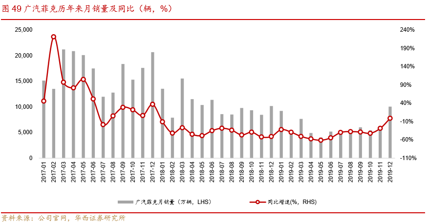 广汽菲克重振产品周期。2019年广汽菲克共推出1款新车和4款改增车,积极推出新款车型,改善竞争力。考虑到2019年12月,广菲克销量同比仅降低1.10%,下降幅度大幅减小,叠加一体化运营以及向好的产品周期或将帮助广汽菲克的业绩止住颓势,逐步实现改善。