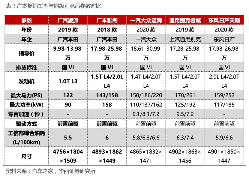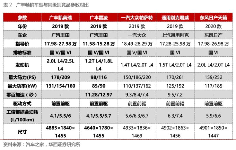与同级别竞品相比,广本、广丰的主力产品在价格和油耗方面优势明显。定价整体比同级别产品低出1-2万元,性价比更高;广汽集团汽车多采用2.0L的发动机,相比其他车企所配置的2.0T发动机更加稳定且油耗量更小,燃油更经济。