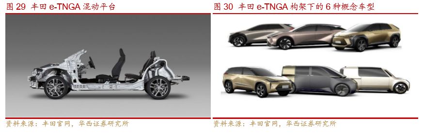 丰田发布e-TNGA平台,差异化锁定HEV市场。丰田e-TNGA架构是一个混动平台,将用于开发十款六种左右的车型包含紧凑型跨界车、中型跨界车、中型SUV、中型小型货车、中型轿车和大型SUV,可以实现多级别车型零部件通用,在提升车辆安全性、轻量化程度的同时降低生产成本。e-TNGA平台支持传统燃油车和混合动力系统车型,并且通过轻量化等设计能将能耗降低25%。在能耗减低的同时,新车动力输出与操控性也将有一定进步。除了e-TNGA前轴发动机与防火墙之间的距离是固定的,前轴电机和后轴电机的底盘位置是固定的,还有电池组在底盘处的宽度也是固定的,车辆的长度、轴距、宽度、前悬与后悬长度可以根据需求进行调整的,灵活度非常高。除此之外,e-TNGA平台也可以根据车辆设计要求,灵活地将驱动电机分别放置在前轴或后轴位置上,实现方便的前驱/后驱/四驱的工作模式。前悬挂、后悬挂、不同电池容量、前后电机功率等方面都可以实现高度自由的重组,从而满足全球市场中各地区多样化的用车需求差异。